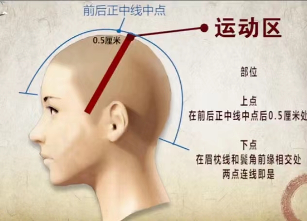 运动区部位(图1):相当于大脑皮质中央前回在头皮上的投影。上点在前后正中线中点往后0.5厘米处;下点在眉枕线和鬓角发际前缘相交处。主治:运动区上1/5,治疗对侧下肢及躯干部瘫痪;运动区中2/5,治疗对侧上肢瘫痪;运动区下2/5,治疗对侧中枢性面神经瘫痪,运动性失语,流涎,发音障碍等。